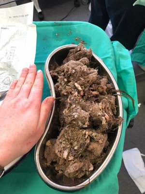During surgery it became apparent that Mikey had ingested a large volume of his bed stuffing that was obviously not digested, creating a gastric obstruction. Mikey underwent a surgery called gastrotomy to remove all of this material.
